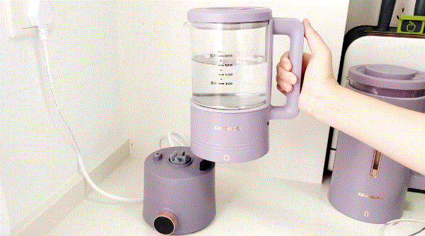 5. 把煮好红豆沙的破壁机拿下,换成养生壶放置在底座上,倒入400ml水煮开。这两个机器的握手设计都挺宽大的,女生一手就能轻松提握,很是轻便。