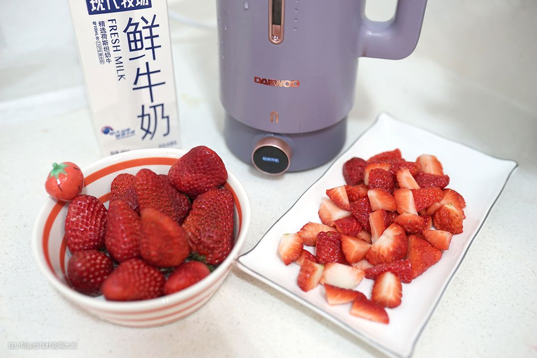 1. 草莓切块倒入破壁机中,倒入300ml牛奶。