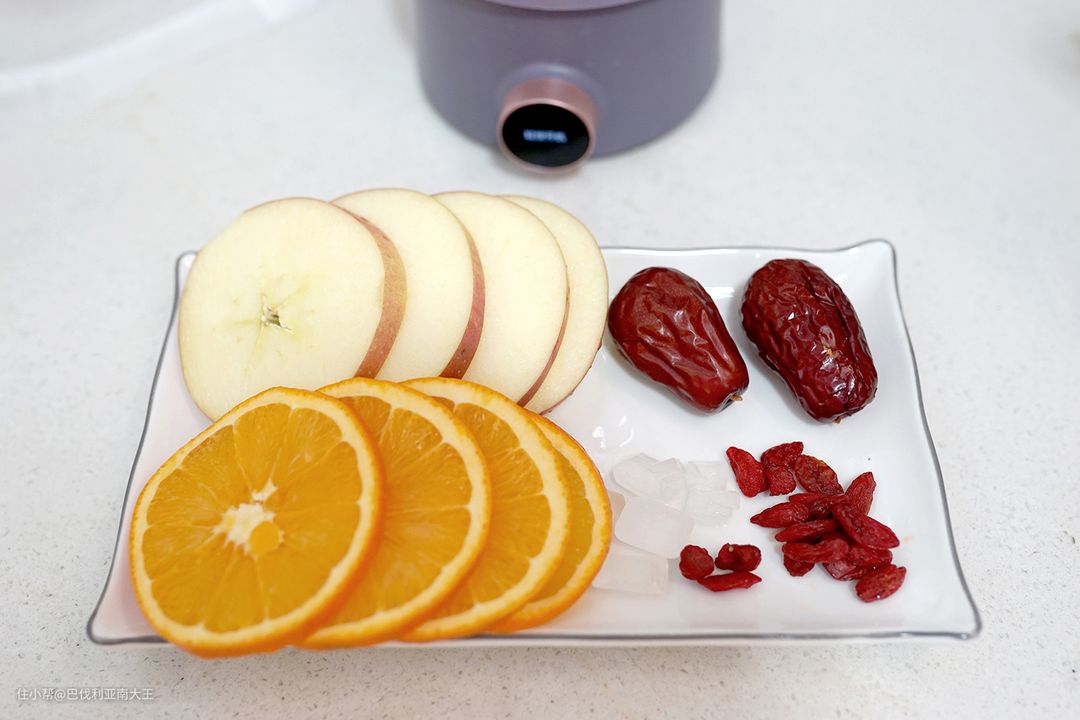 1. 橙子用盐水浸泡搓洗干净去除外皮苦涩味,然后和苹果一起切成薄片,统统加入养生壶中,加水至600ml。