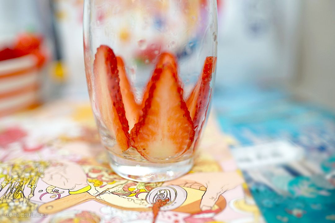 3. 等待期间,找2颗草莓切薄片,贴到杯子的内侧,切的越薄,贴合度就越好。