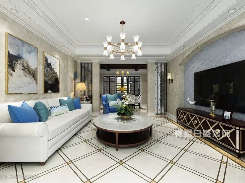 大空间中,选择与沙发匹配的方形茶几,方形茶几的摆放更符合大部分人的使用习惯,家里有小孩的担心磕碰,可以买几个防撞条。