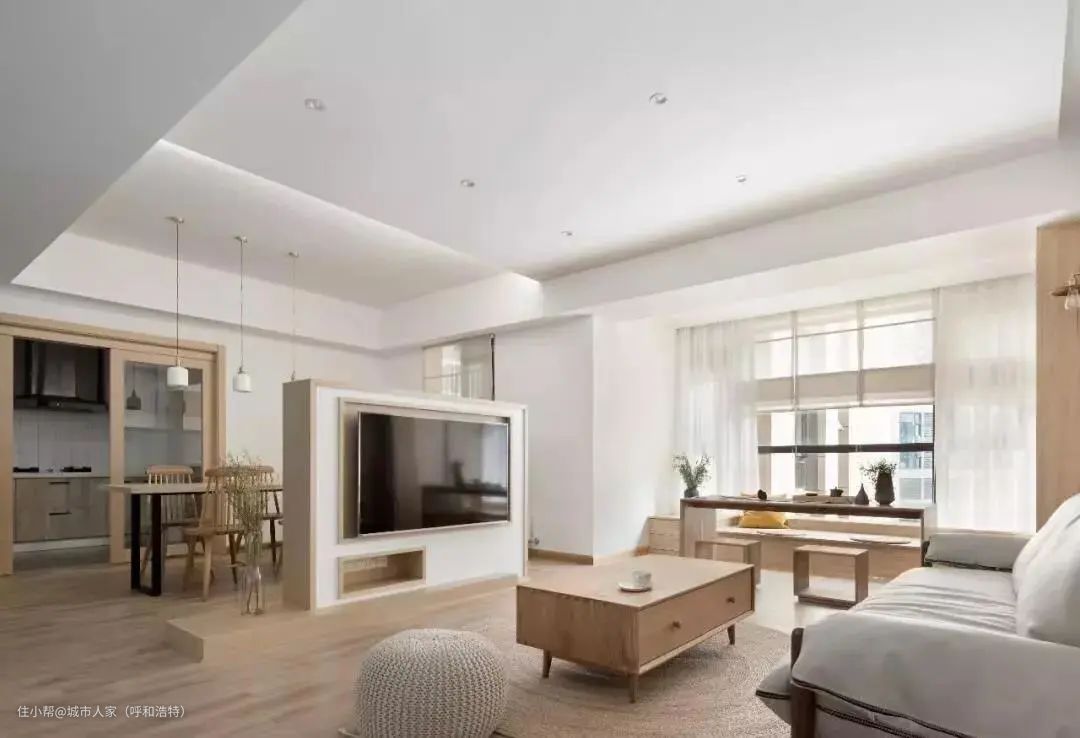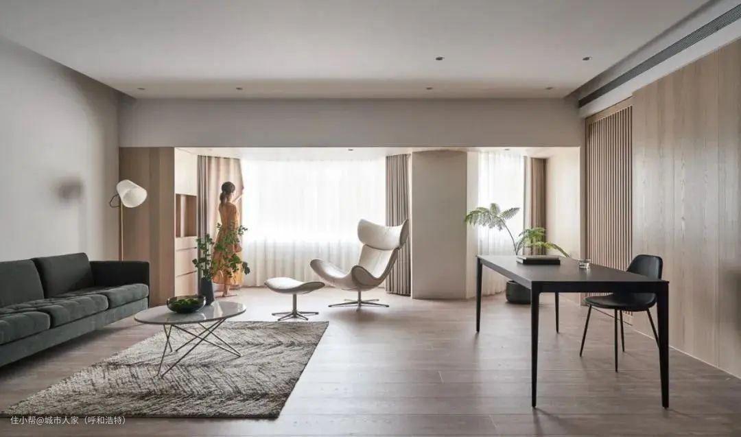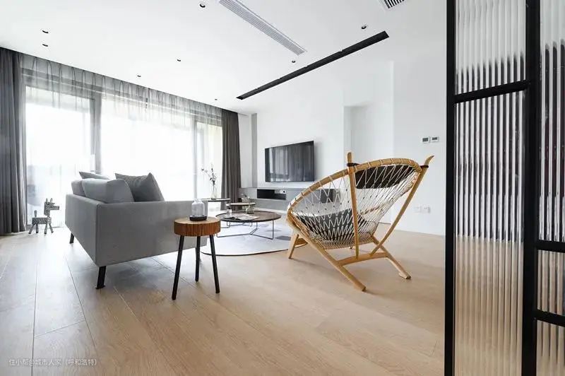 沙发不一定要对着电视墙放,而是取一面合适的靠墙区域,这个适合不爱看电视的家庭。剩余的空间可塑性也很强,可以根据自己的需求和喜好来设置。