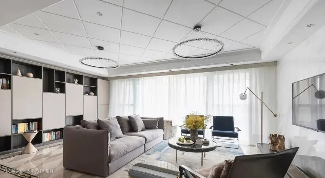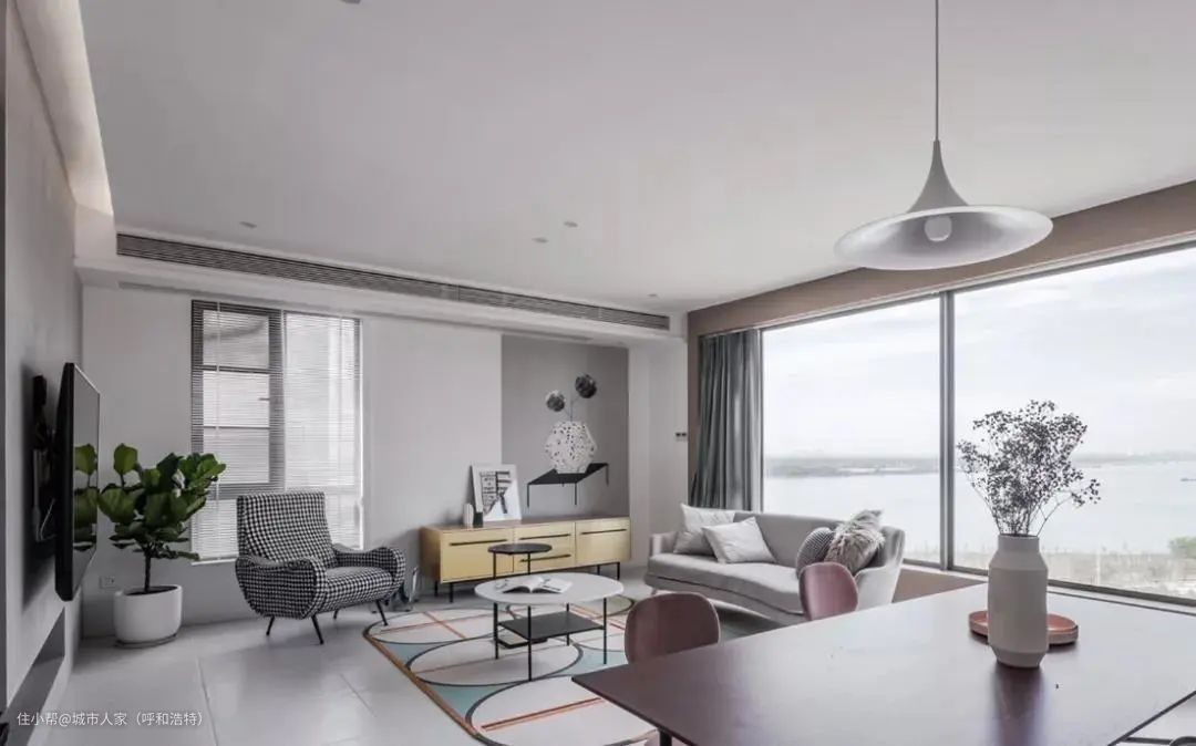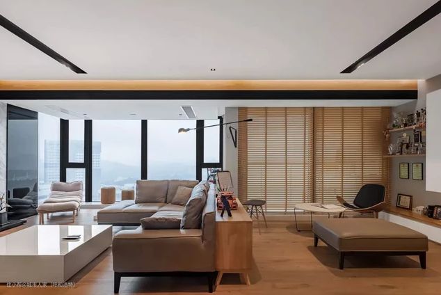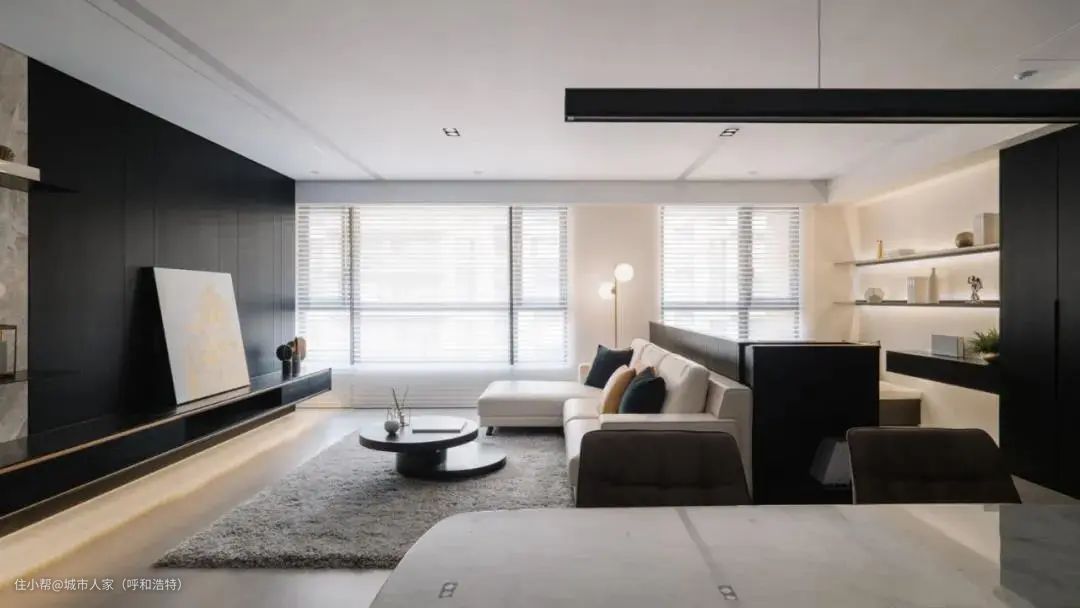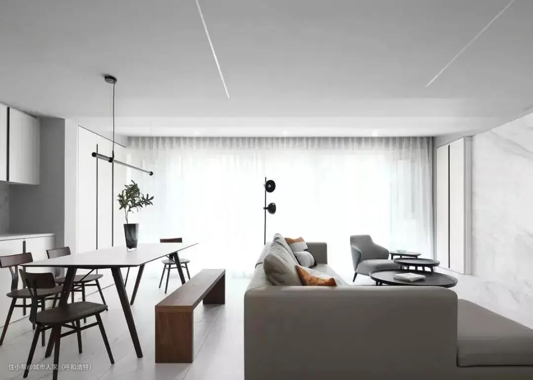 这种设计方式需要注意沙发的尺寸,不能太大也不能太小,太大会影响动线,太小则会显得空间空旷,所以在选择沙发时一定要根据户型大小实地测量。