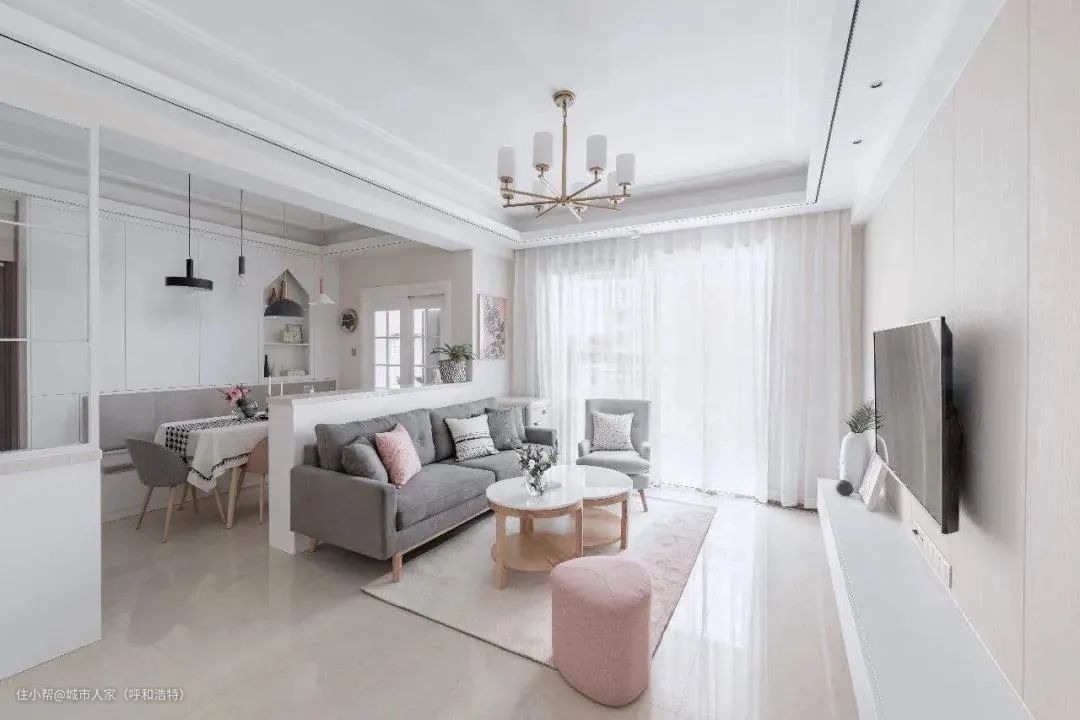 很多讲究坐着要有靠山,沙发不靠墙,感觉不踏实。这时,可以选择在客餐厅中间砌个矮墙,然后沙发靠着矮墙布置,既能缓解不踏实的感受,又能保持空间的通透大方。
