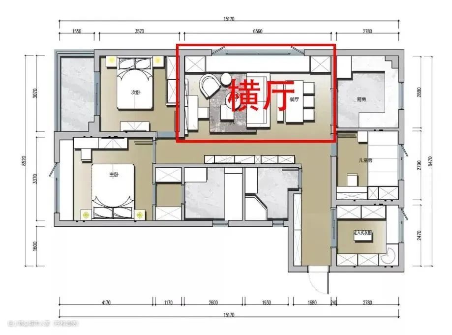 横厅把走道纳入到客餐厅区域,没有明确的空间界限,可以提高户型的使用效率,减少空间的浪费。
