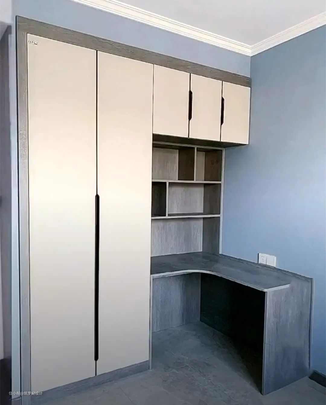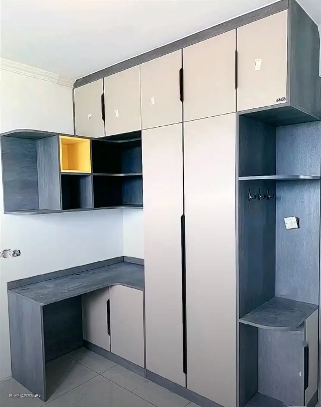 不过这种设计除了卧室以外,还可以设计在衣帽间。有书房的同样也可以这样装,特别是有二胎的家庭,即便有书房,一张桌子也不够两个宝宝的学习需求,分别靠墙打造两个转角书桌,既能收纳衣物还能拥有学习区,省空间更实用!