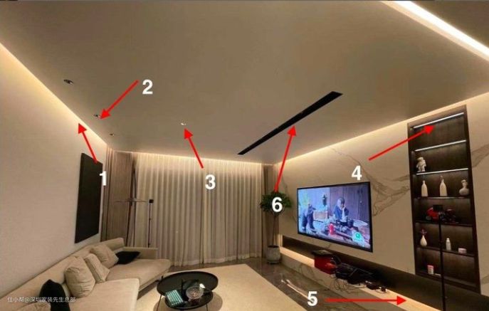 客厅中照明的位置可能包括三块面板:天花板,电视墙和沙发墙。