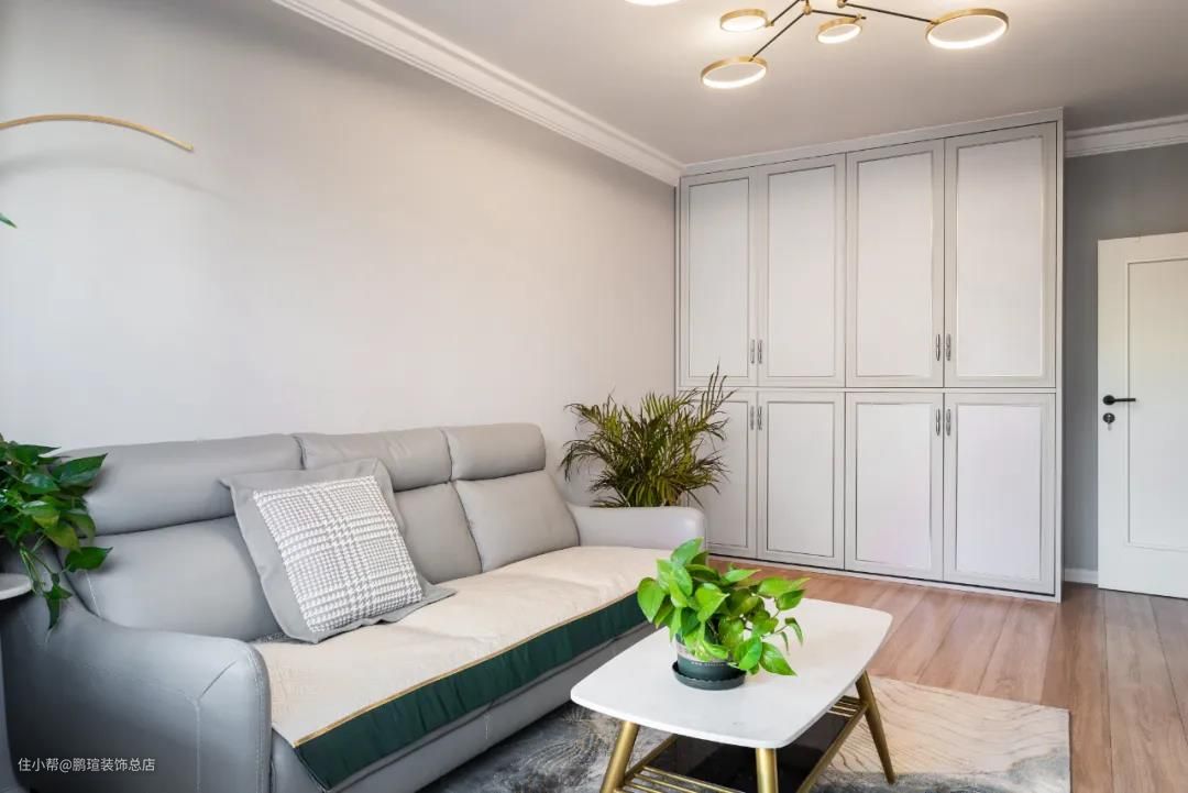 客厅另一侧是一个顶天立地柜,与墙面、顶面、沙发的颜色相得益彰,它上面的简洁线条,打破大面积纯色的单调与无聊。绝对不容忽视的是它强大的收纳能力,不论这里是客厅还是卧室,想放的物品都有充足的地方收起来,轻松保持表面的干净与整洁。