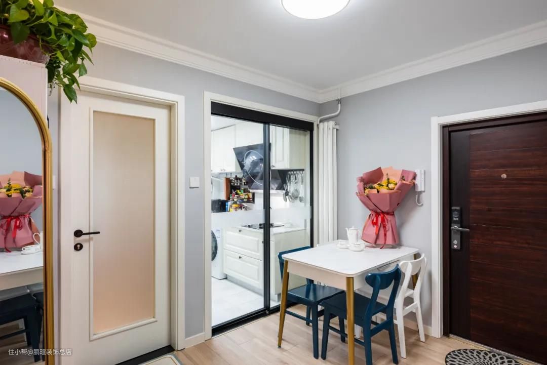 原始结构,进门就是厅。将原本的客厅改为餐厅,既保护了隐私性,同时也提升了使用的舒适度。设计师拆除了厨房门,换成推拉玻璃门,借助厨房光线使餐厅明亮通透。