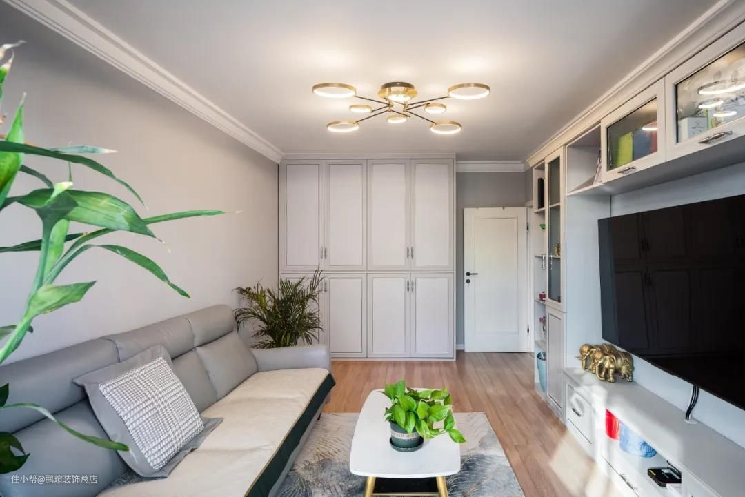 将原始的主卧改为客厅,电视墙设计出了满满的收纳空间,既好看又能装。拆除阳台处的门连窗,让整个空间的视野更加宽阔,而且拓展了客厅的面积,可以承载更多娱乐休闲的行为,摆放一个折叠床,客厅秒变卧室。