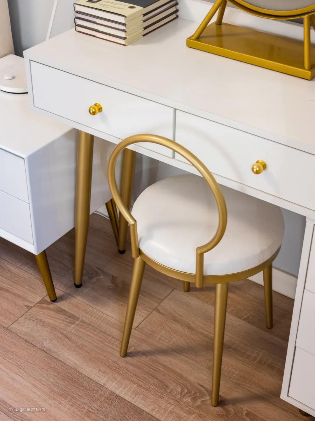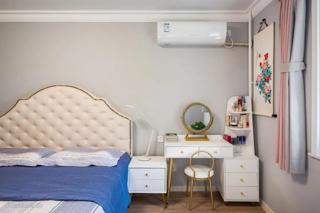 浅粉色的衣柜和一个精致的梳妆台,体现了对女主人的关怀。蓝色的床品,让空间增添了男主人的生活气息。再加上时下热门的轻奢元素——黄铜,低调有质感,显得空间很有格调。