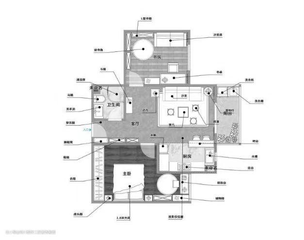 整个房子的动线流畅以客厅为中心,往两边流动分别是家务动线:客厅+厨房+餐厅 居住动线:主卧室+书房+卫生间。户型动线符合日常的生活习惯,可以让进到房间的人在移动时感到舒服,设计简洁。