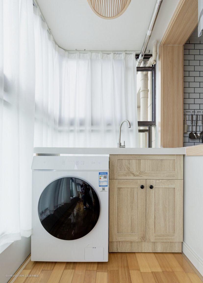 被扩入客厅的阳台,在兼顾颜值的同时,依旧保留了基础的洗衣晾晒功能,还增加了一组大件物品存放的储物柜,将生活杂物一揽而尽。
