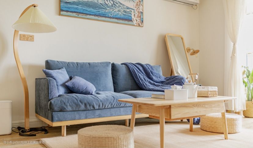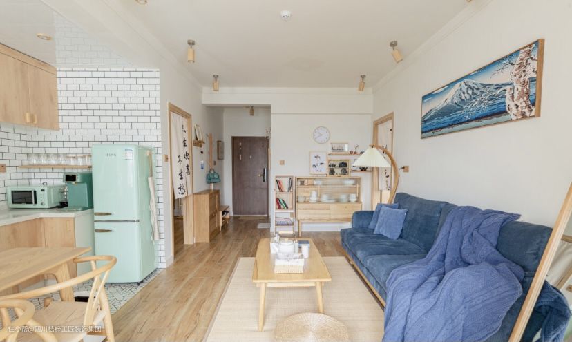 大面积木质家具,蓝色家居用品的采用既清爽又有温润质感,整体简单浅色设计能将光线最大化的引入室内,让房屋告别昏暗。
