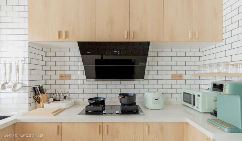 U型的橱柜布局,小小的几平方,动线却被规划的很合理;左边是洗菜的功能,连接着中间是切菜操作的台面,再转过来就是一个炒菜的区域了。整体的橱柜设计:吊柜是木色的哑光烤漆柜门,地柜使用木色来衬托;色彩视觉的对比显得明亮、稳重。墙身柜体之间贴的是小白砖,操作台面采用的是白色人造石。整个空间搭配起来很温馨、舒适。