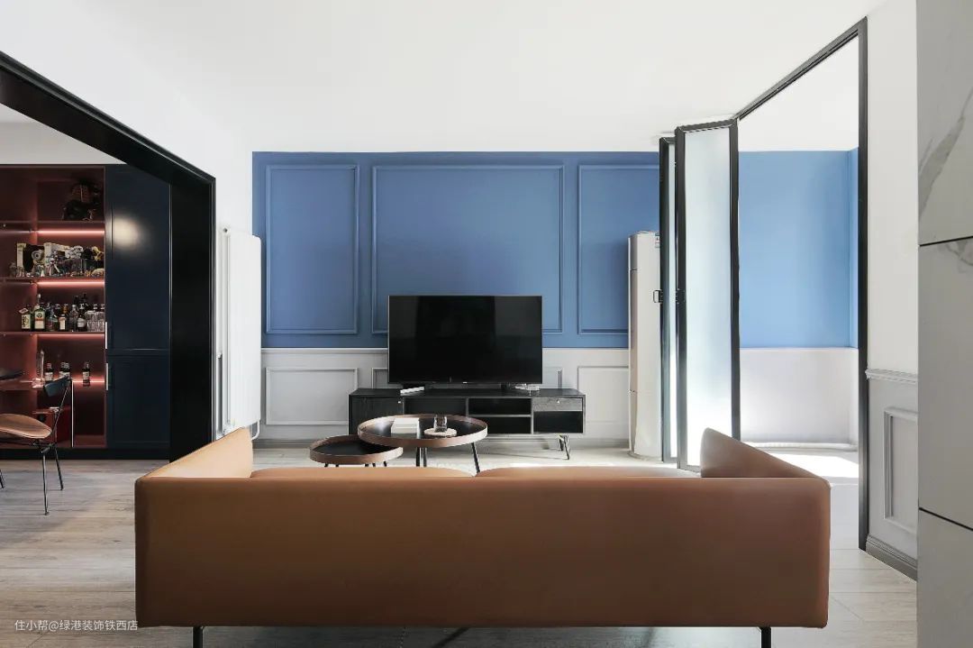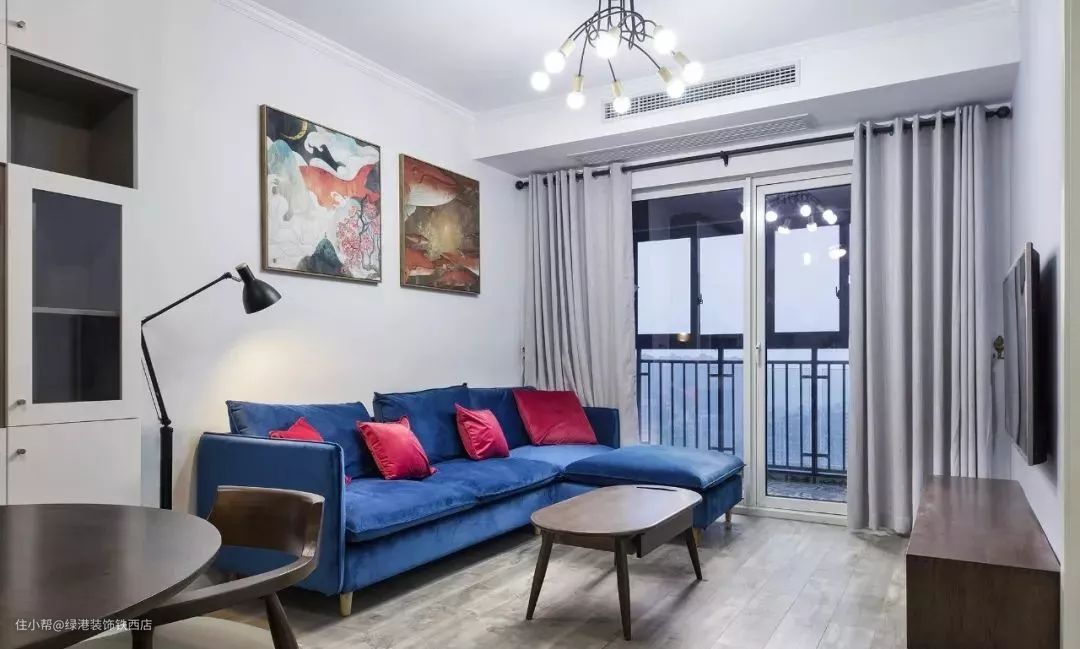 进入客厅,映入眼帘的是蓝色丝绒沙发,搭配红色丝绒抱枕,大胆的撞色,显得很时髦。墙上的挂画,有着中式动画《大鱼海棠》般的古典与浪漫,极具巧思。复古与时尚在这个空间汇聚。