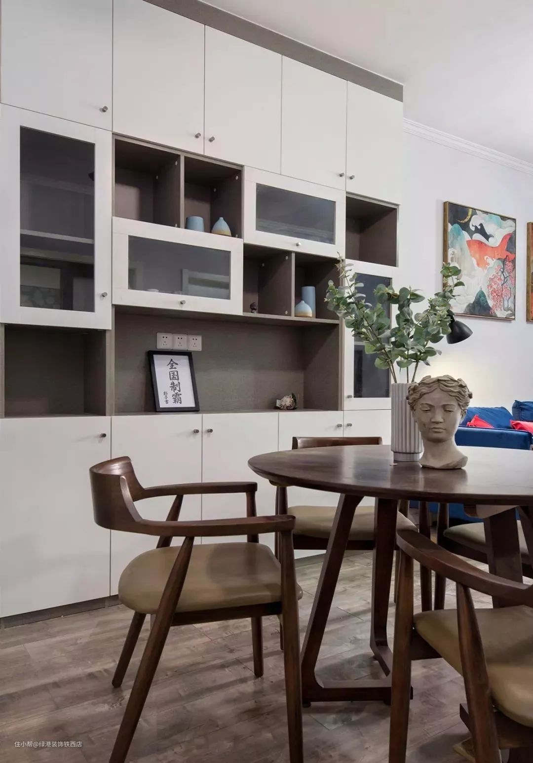 圆形胡桃木餐桌与客厅的茶几、电视柜形成呼应,格调一致。餐边柜底部和顶部的柜子用于收纳,中间做为展示和备餐区,实用性较强。