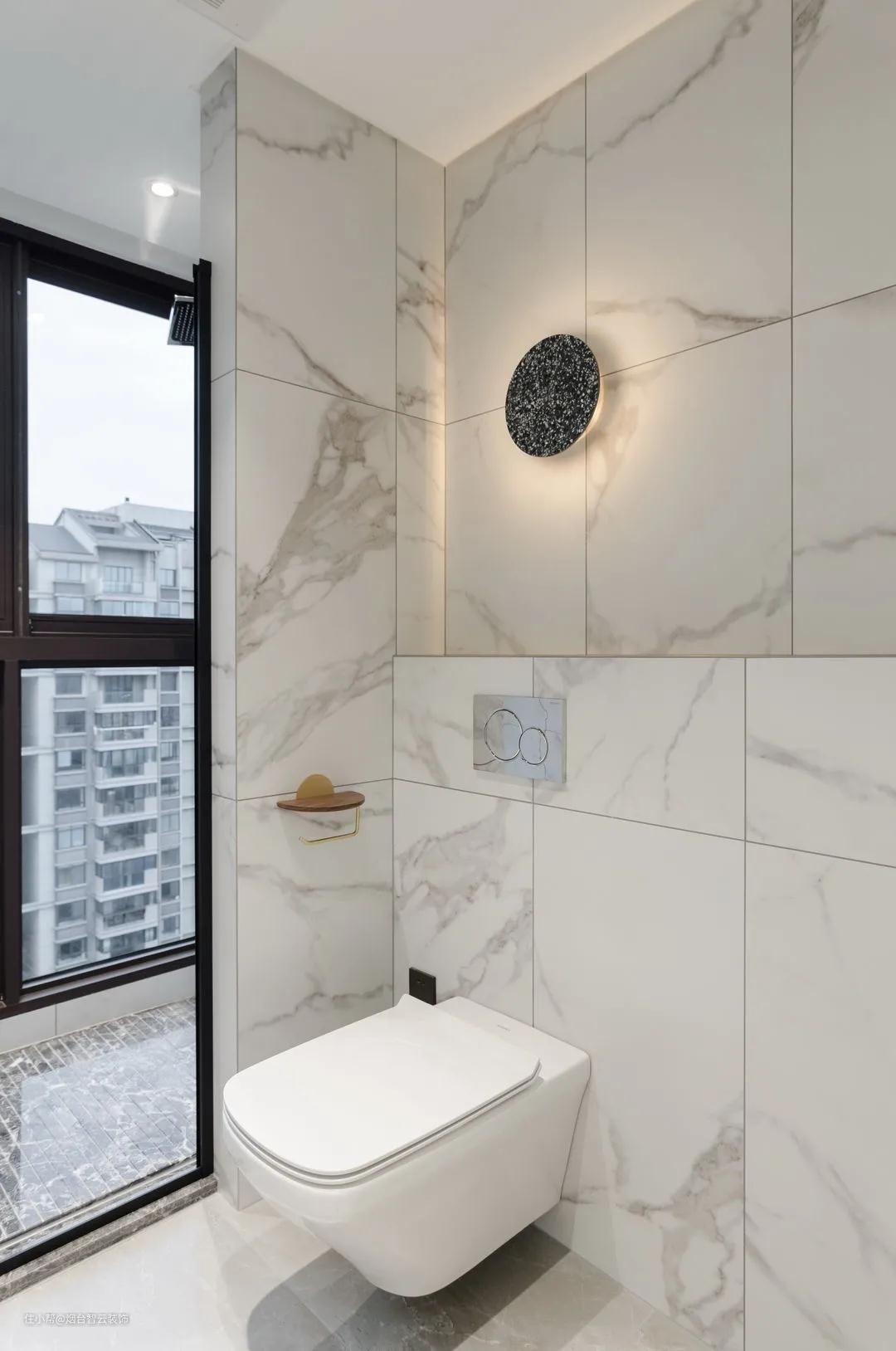 马桶和淋浴区,空间设计上还是蛮通透的。壁挂式马桶有效的节省空间,又让清洁变得简单。搭配精致圆形壁灯,还是相当不错的。