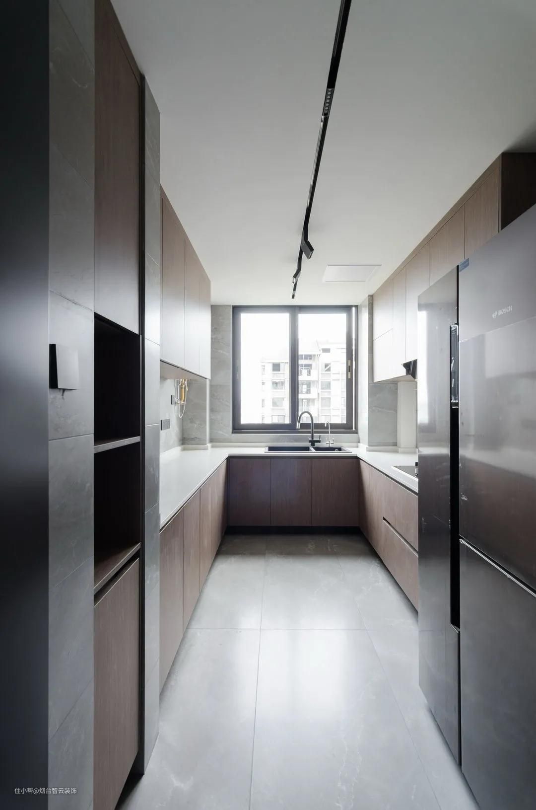 厨房延续了公共空间配色,整洁得体大方。U型厨房设计,为厨房提供了充足的操作空间与收纳空间。单排灯槽设计,带出空间进深感。