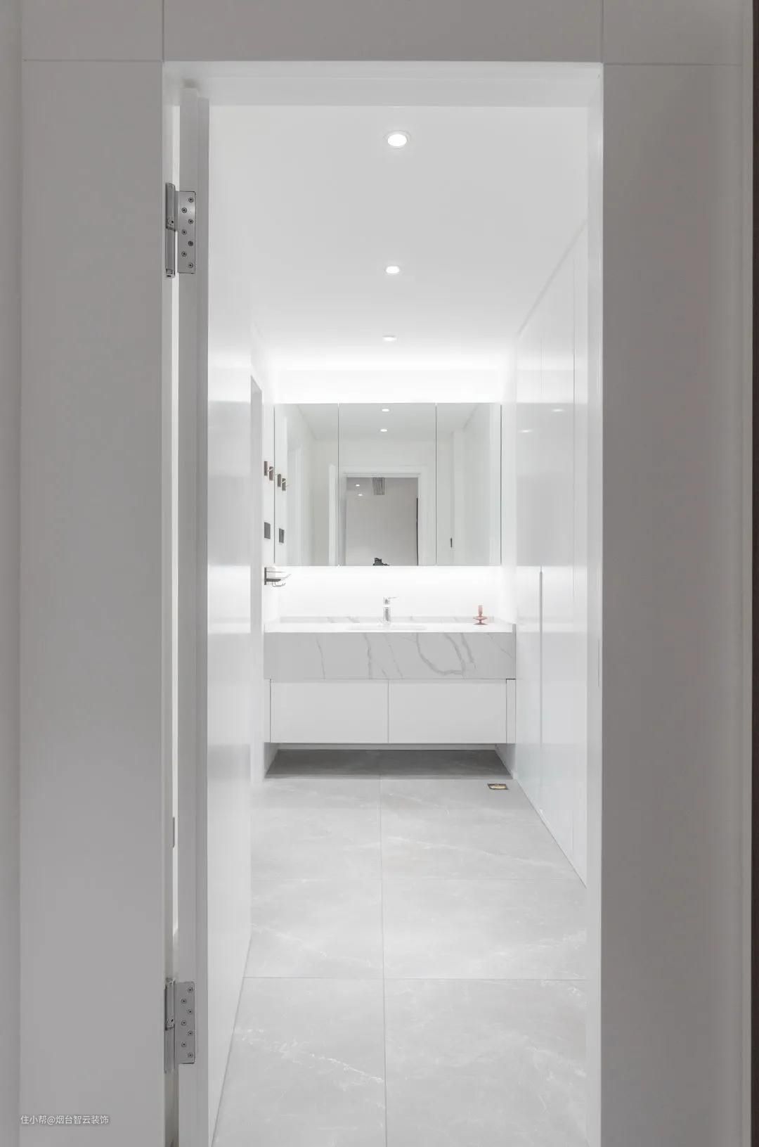 隐形门打开,步入卫生间干区,通体亮白设计让空间更敞亮,延续了无主灯设计风格,利用筒灯与灯带结合照明。右侧为收纳柜,无明装门把手设计,整洁美观。