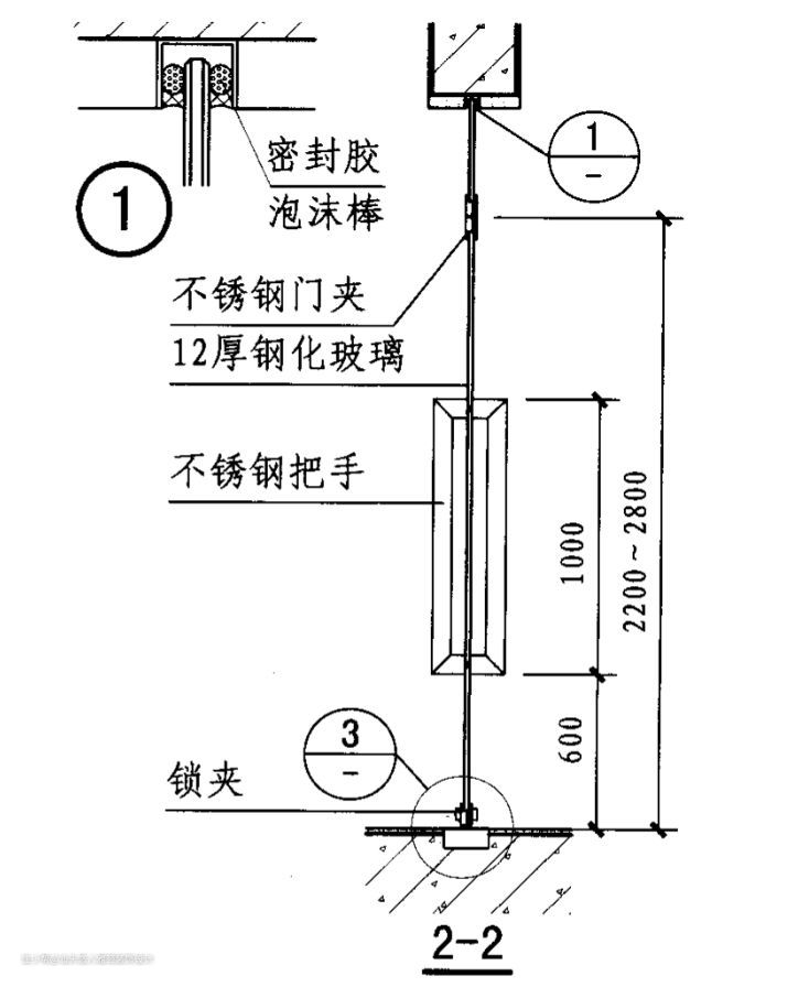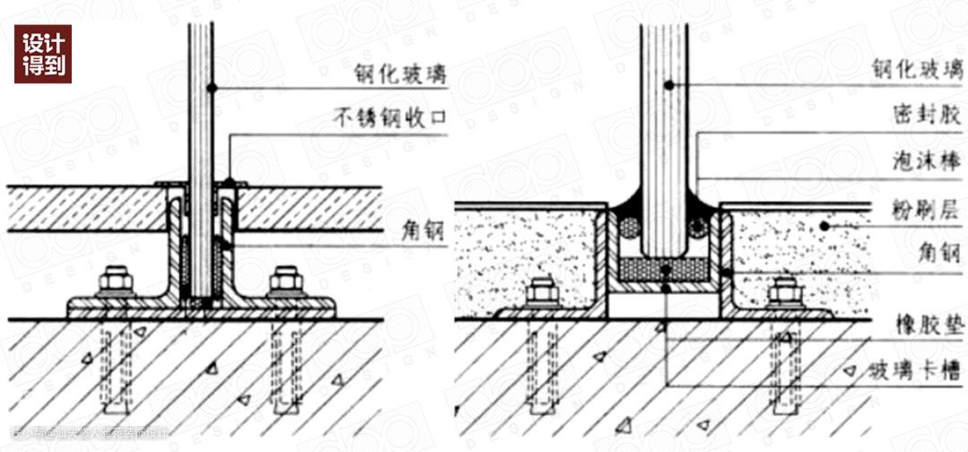 可以把槽口所呈现的凹槽理解成玻璃框,即所谓的“框支撑”。要掌握框玻璃形式的纯玻璃隔断节点构造,只需记住玻璃与吊顶的固定方式,玻璃与地面的固定方式即可。