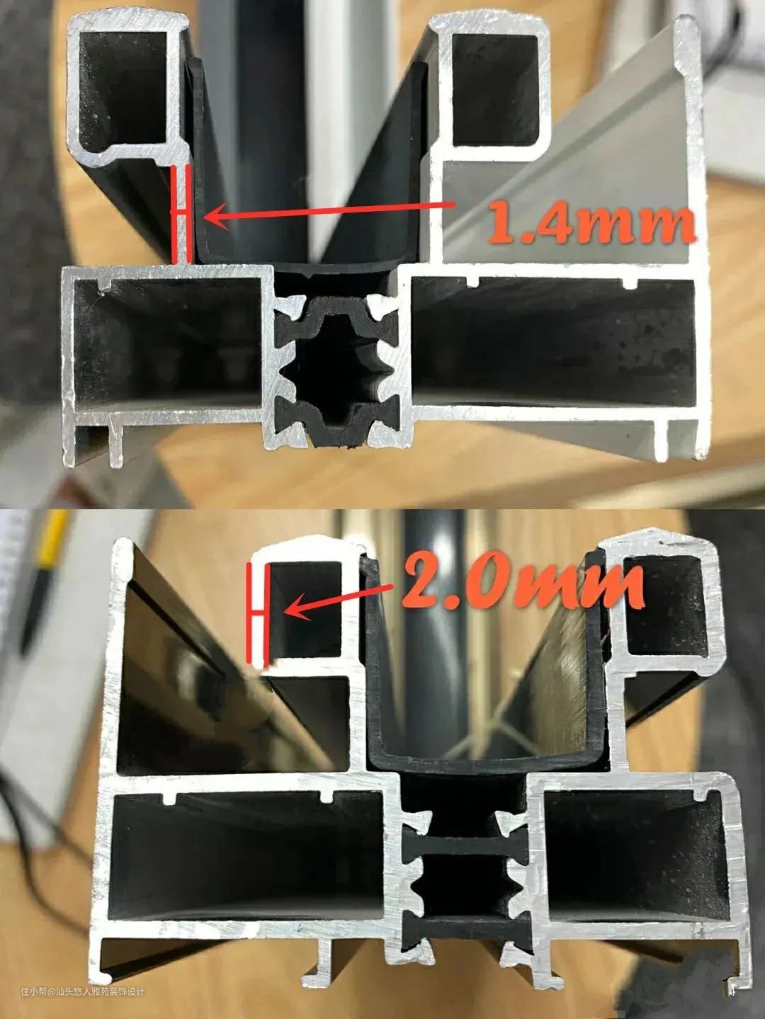 型材壁厚要达到国家标准1.4mm,高端一点的可以达到1.8mm,劣质断桥铝型材大多数在1.0~1.2mm壁厚之间。