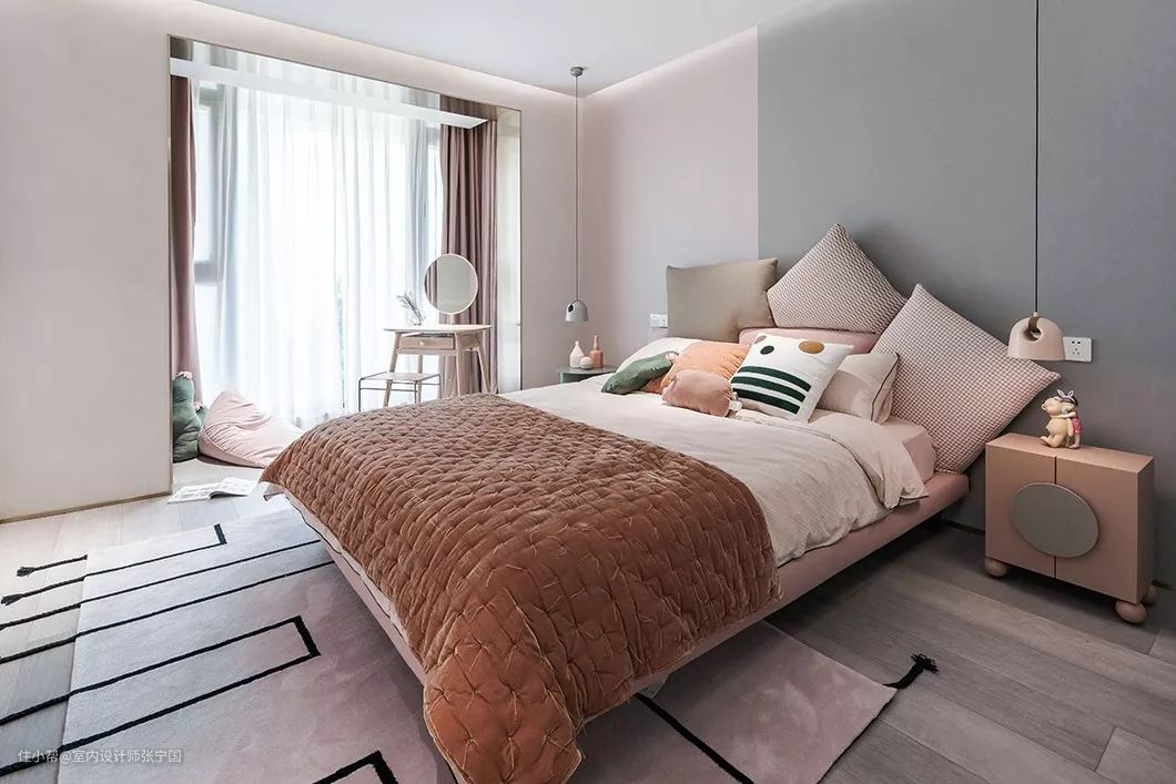 女儿房的设计采用粉色和高级灰作为背景,特别选择样一款不规则的几何色块床,用很多靠枕堆砌的造型营造出温暖活泼的感觉。床头两侧的床头柜和吊灯也选用了不对称的设计,充满童趣。