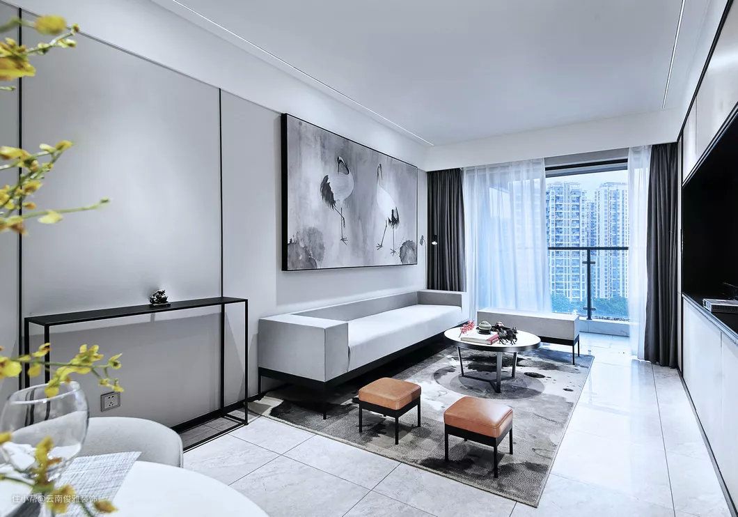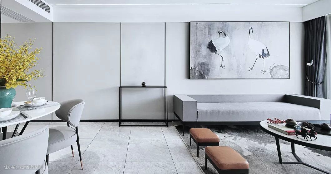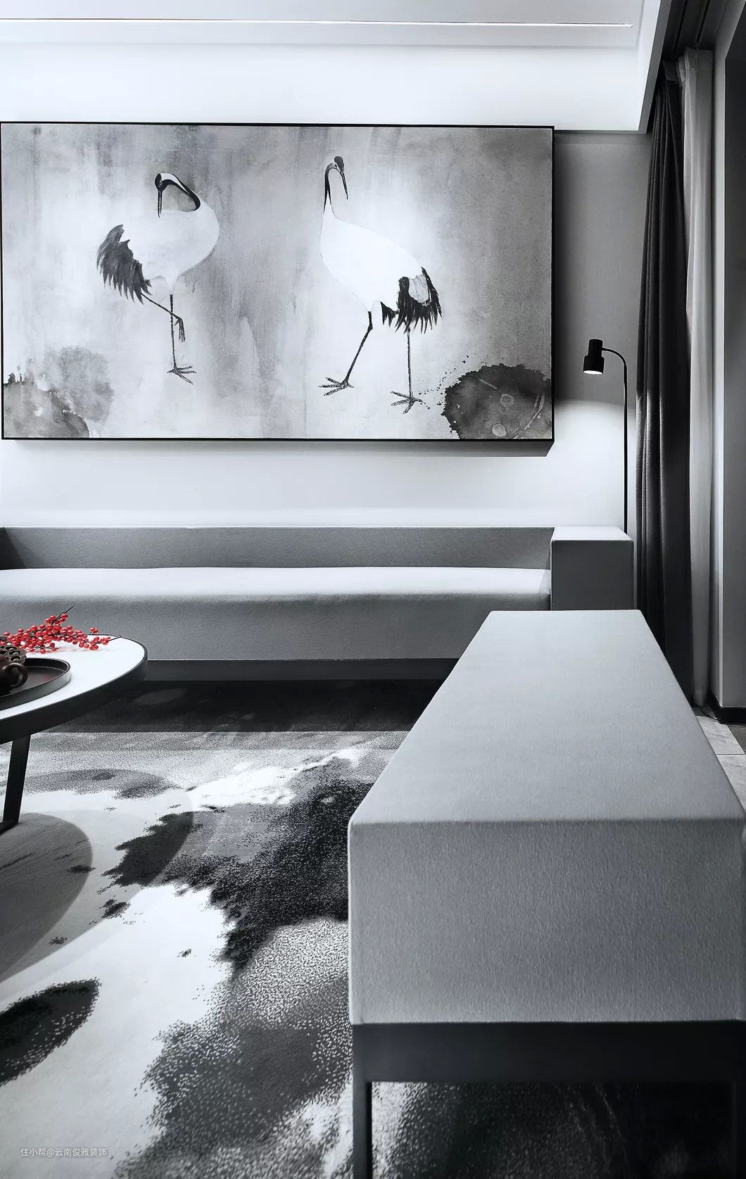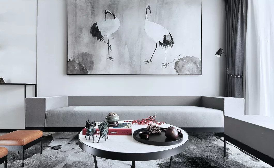 地面通铺灰色地砖,墙面淡雅的灰色,结合简单的线条装饰,营造出简洁,淡雅的新中式氛围。黑白灰色调的仙鹤装饰画,与泼墨地毯有呼应的效果。