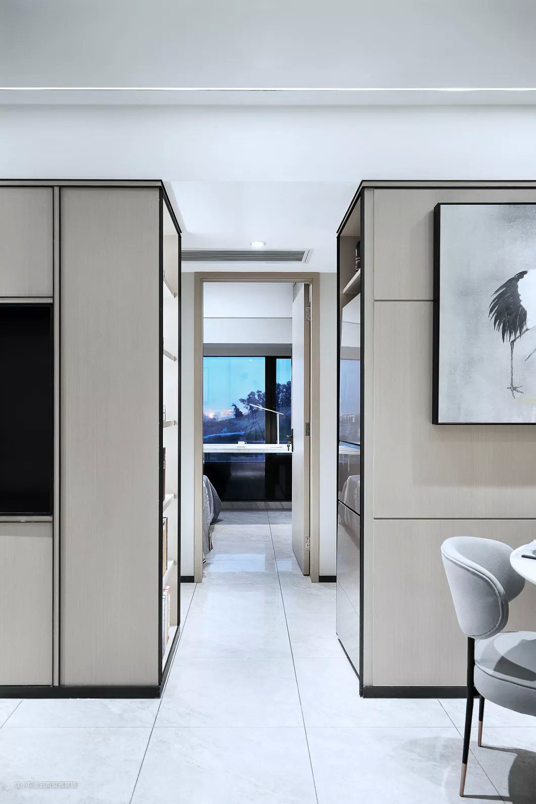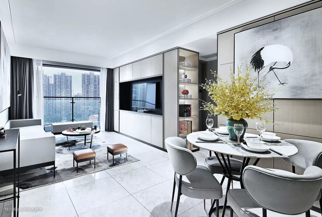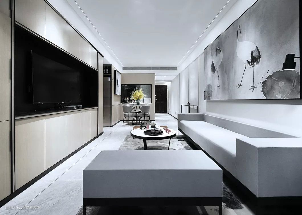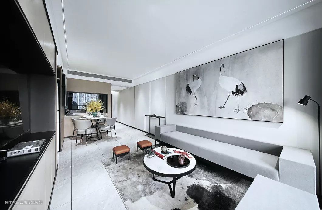 地面通铺灰色地砖,墙面淡雅的灰色,结合简单的线条装饰,营造出简洁,淡雅的新中式氛围。黑白灰色调的仙鹤装饰画,与泼墨地毯有呼应的效果。