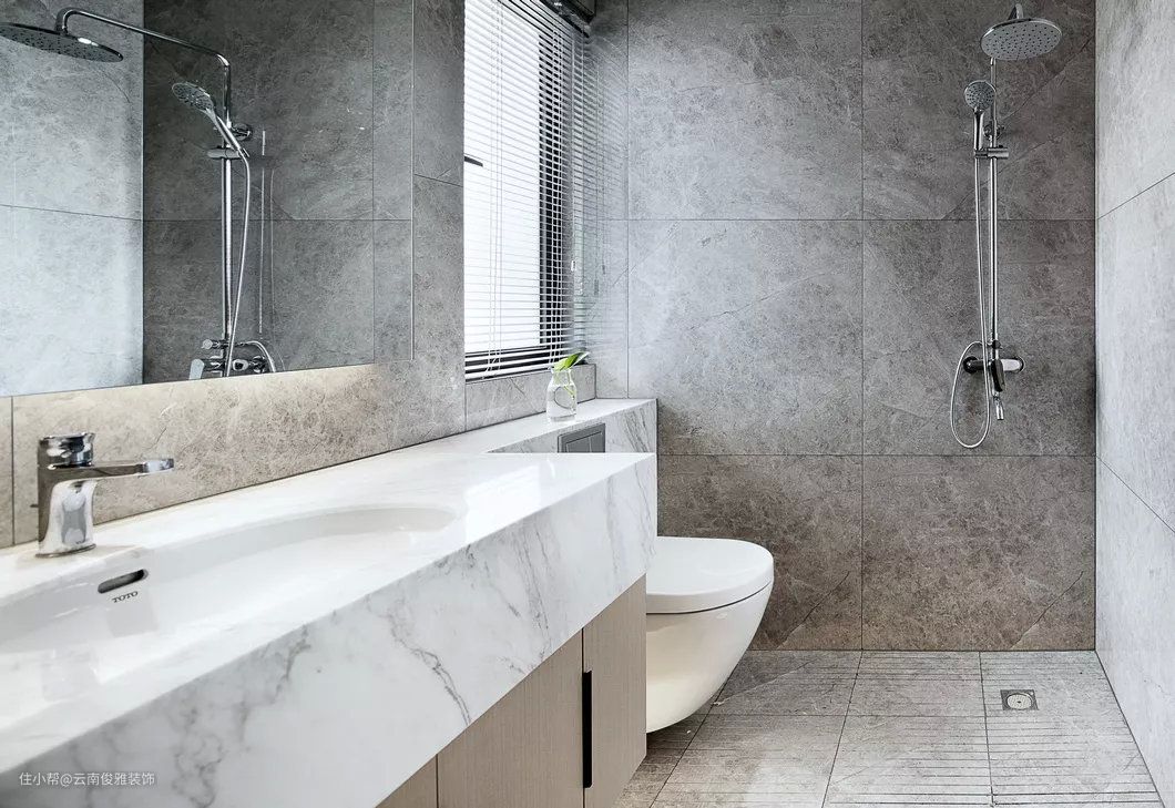 米白色大理石质感的洗手台与地砖,结合灰色的墙面砖,装扮出一个简洁大方而优雅的卫生间。