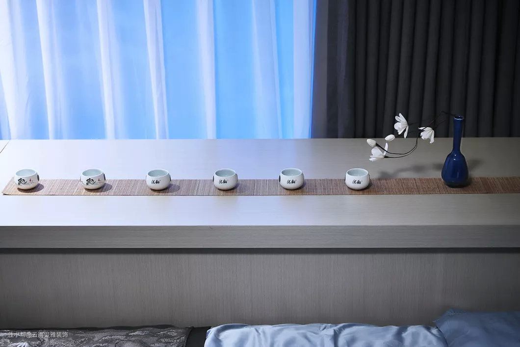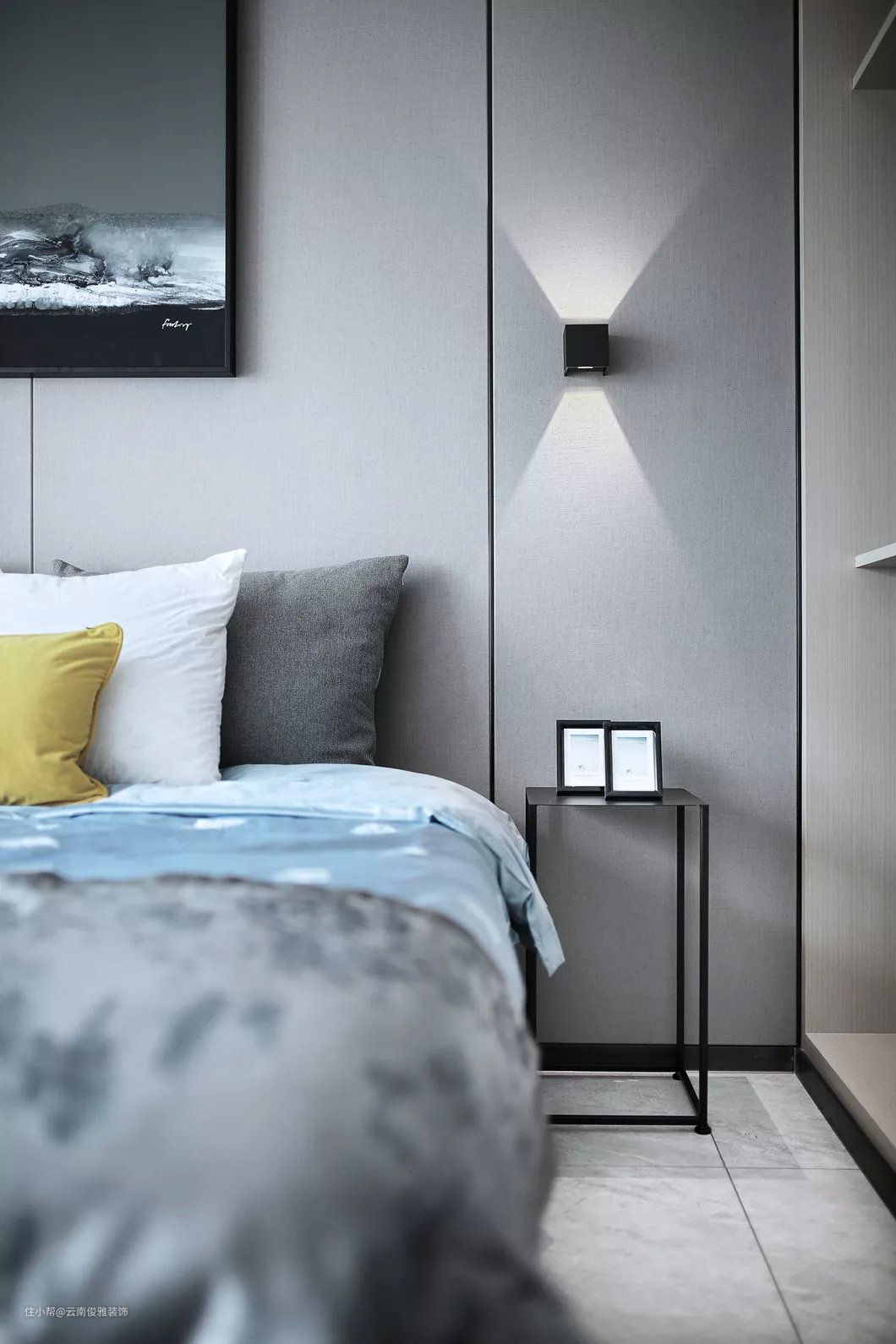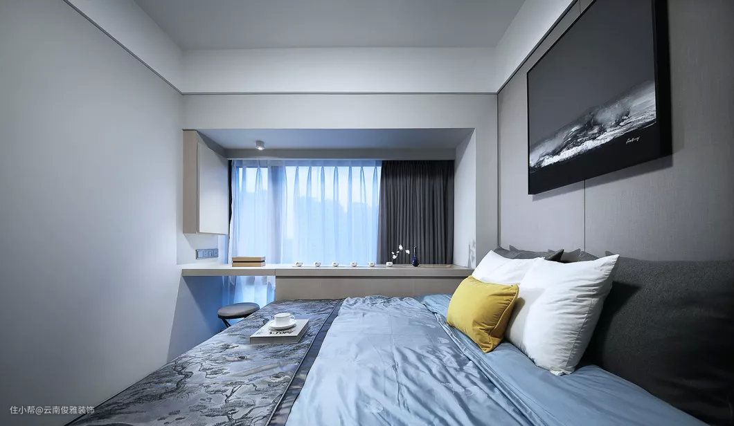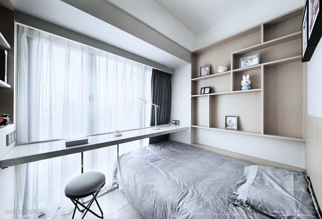 卧室靠窗的位置打造成吧台书桌,坐在窗前看风景,读书品茶,岂不美哉。软装处理的床头墙,摆一个极简框架的床头架,结合壁灯的衬托下,形成一个简约年轻的卧室。