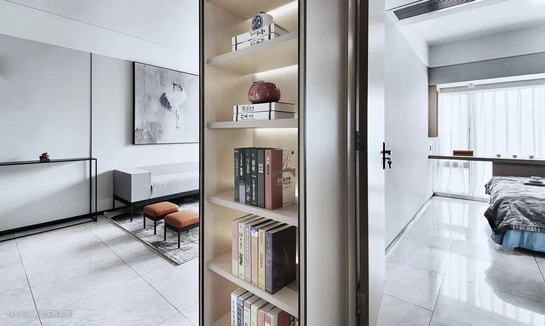 次卧的床与靠窗的腾空书架交错的布置,同时墙面还装了一面收纳架,让小空间得以最大化的利用。