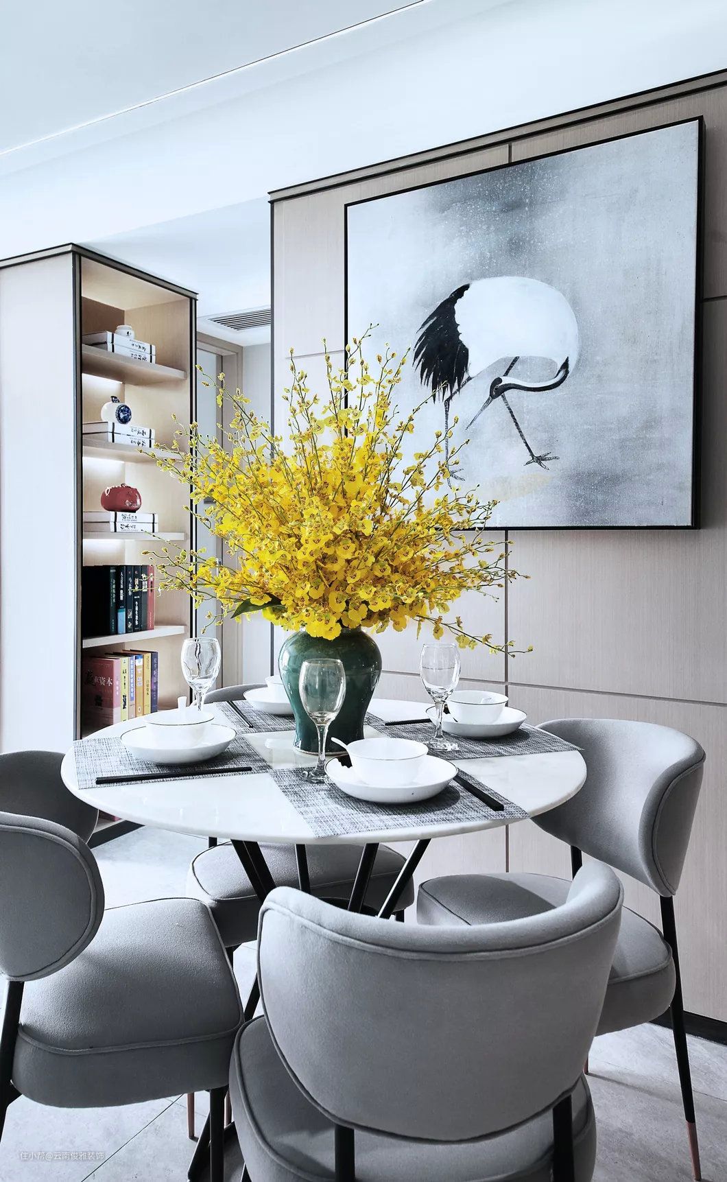 客餐厅在一个开放的空间内,整个风格格调保持一致。装饰画也是个系列的。圆形大理石餐桌,搭配上布艺餐椅,结合精致的餐具布置,营造了一个浪漫简约的用餐环境。