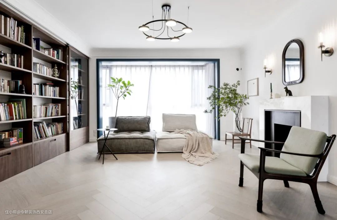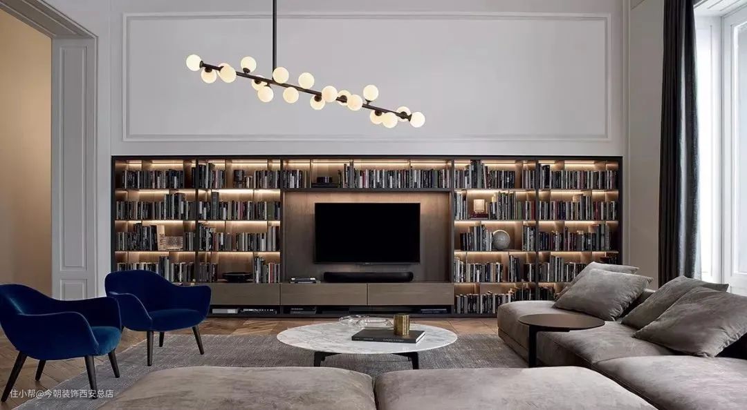 或是直接把阅读功能作为客厅的重心设计,将书架摆放在更加合适的位置。