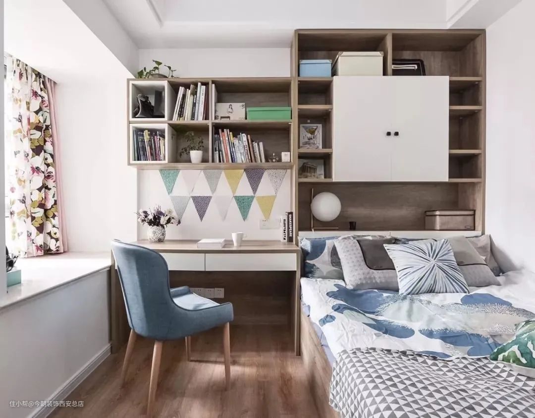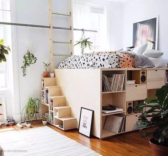 床尾有置物架的话,也可以拿来放书,或者将床板下改成书架,特别适合小户型家庭。