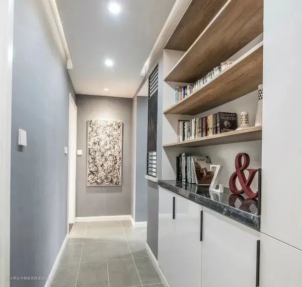 过道的利用率在家里并不高,基本就是闲置空间,拿来做成书架刚刚好,过道书架可以做成内嵌的,不压缩过道的宽度。