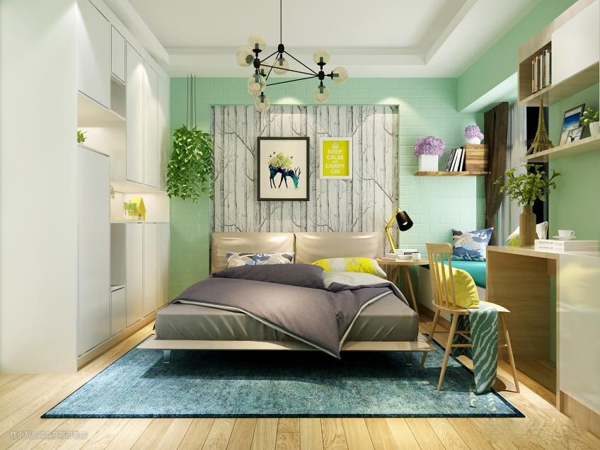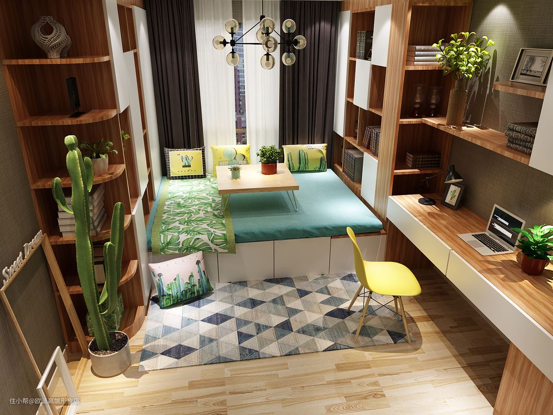 清新的搭配,榻榻米延伸飘窗给休闲区域更舒适的氛围。转角书桌更集中于储物功能,看书累了,靠着榻榻米看着窗外的美景,也是轻松的好方式。