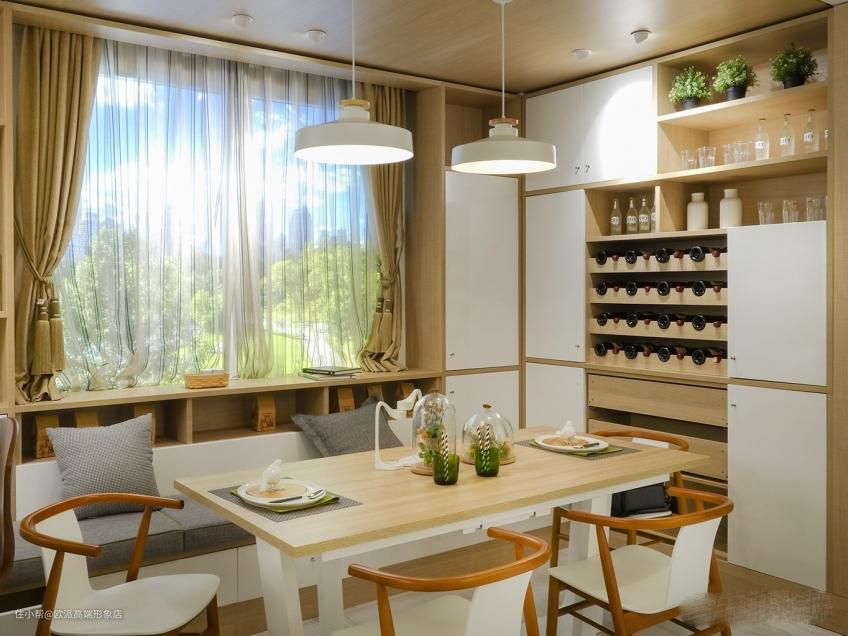 餐厅空间不够?没关系加上飘窗就完全够了,墙面空间延伸到飘窗打造功能全能的餐边柜功能,将储物、酒柜、装饰统统都齐全。