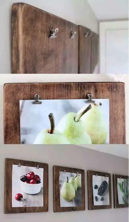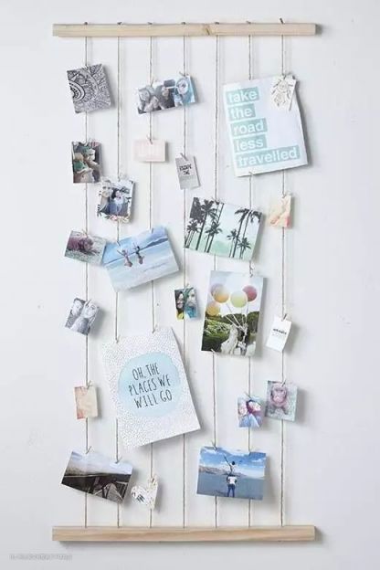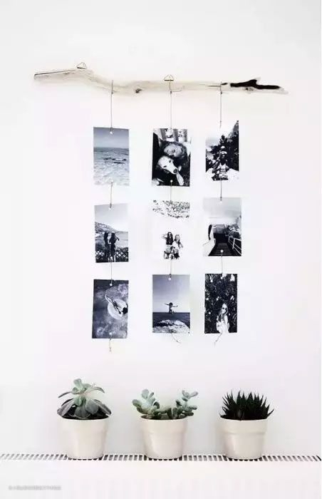用枯木干枝做桥梁,把照片高低错落的挂上去,很有格调充满意境的照片墙就诞生了,还可以用两条木块固定多条细绳,照片就像琴弦上跳动的音符点缀其中。
