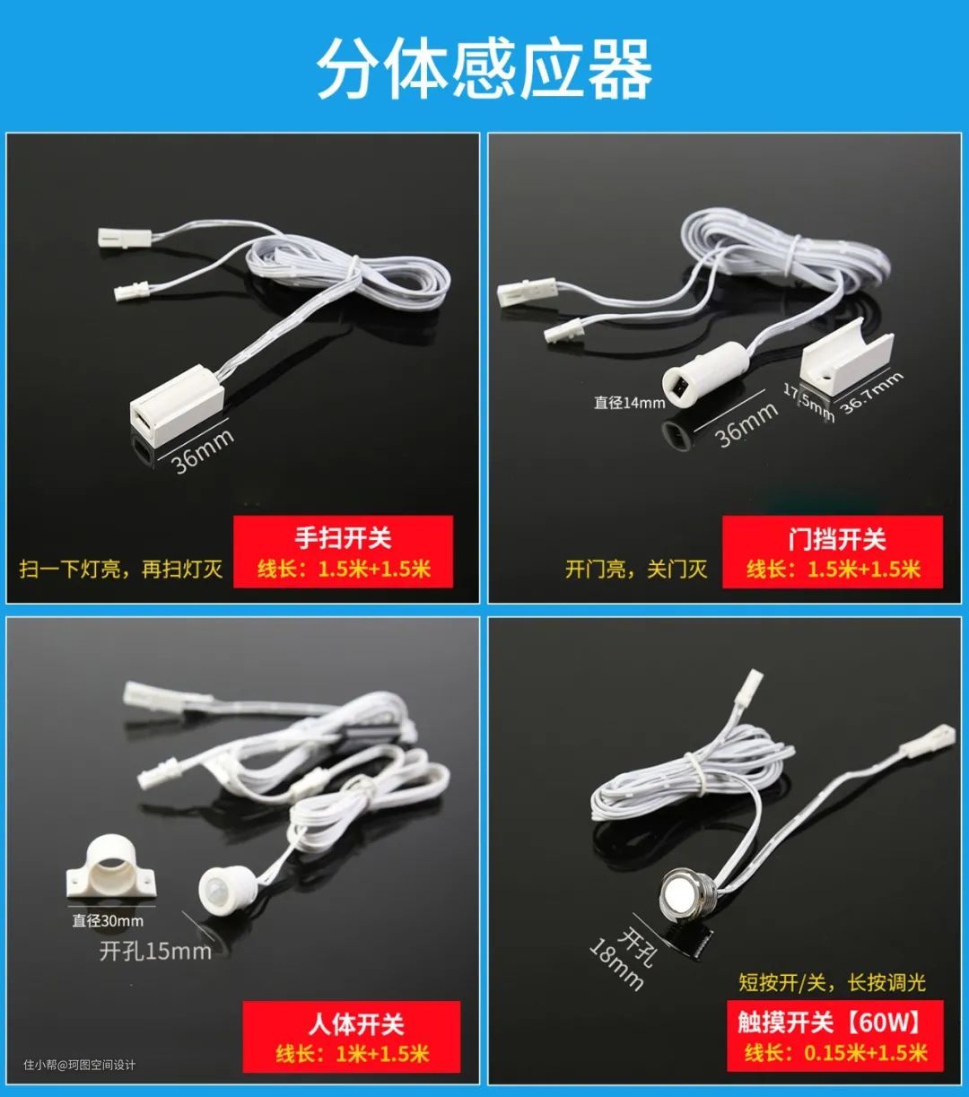 - 注意,分体感应开关也有很多种形式,手扫开关、人体开关等等,大家可以根据自己需求来选择。
