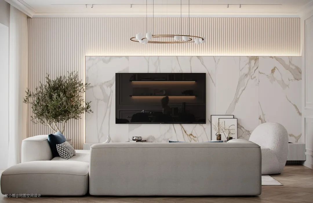 - 对于墙面不是单一材质的背景墙来说,灯线可以安装在不同材质的拼接处,这样可以形成过渡更好的将两种材质融合,增加背景墙的立体和层次感!