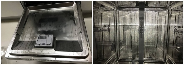 ▲普通热风烘干的洗碗机底部多为塑料材质,这样能大幅降低成本。但塑料导热性差、油污容易残留在底部。久而久之在左右接缝处会藏污纳垢。