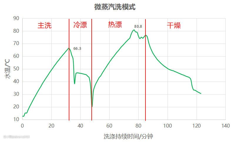 ▲之前我实测的海尔13套独嵌两用EYW13028BKTU1消毒型洗碗机,采集仪记录时间设置为1分钟采集一次内腔温度。微蒸汽洗共经历4个洗涤阶段。温度最高在热水漂洗阶段、达到了官方宣传的80.8℃,而主洗最高温度也达到了66.3℃