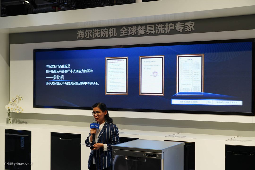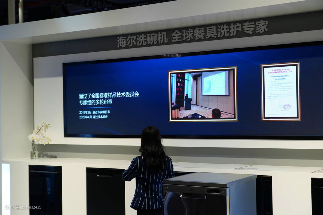 ▲在23号下午3点整的AWE 2021海尔洗碗机展柜前,海尔发布了一款国家能效标准样品机的小型发布会。