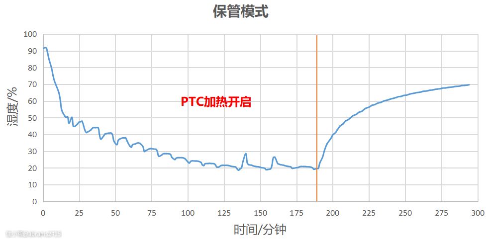 ▲我在洗碗机内部塞入湿度传感器实时侦测内腔湿度变化,数据可反映出程序结束后开启PTC热风烘干,内腔湿度从初始92%降低到20%。185分钟后程序PTC加热停止,湿度会缓慢回升到70%。 所以最安全保险的方式还是及时开洗碗机舱门。