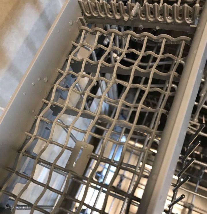 ▲实际上,晶蕾烘干效果只比冷凝烘干强了一点。仔细想一下,也对!因为能量不会无故出现和消失、这些被晶蕾吸收的能量其实也在消耗能量。而这些被吸收的热量不足以烘干内腔内的所有餐具。因此晶蕾烘干对塑料等材质餐具烘干效果力不从心,在碗篮、餐具上都有残水存在