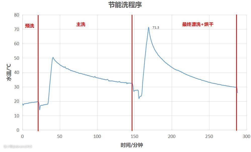 ▲上图是我实测的西门子SK256B88BC节能洗不同洗涤阶段水温变化。可以看到最终漂洗阶段水温提高到71.3℃,一方面进行餐具消毒工作、另一方面是为冷凝烘干做好准备
