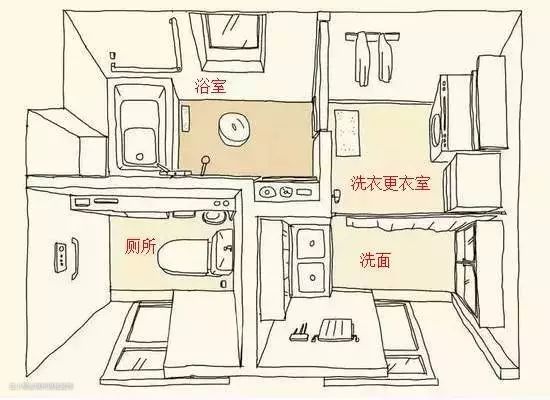 看着四个功能区需要的面积肯定很大,没有个十几平肯定做不了。其实对于我们国家来说,专门的洗衣区可以不要,将洗衣机放在阳台等地方都行,这样就变成了“二式分离”和“三式分离”。