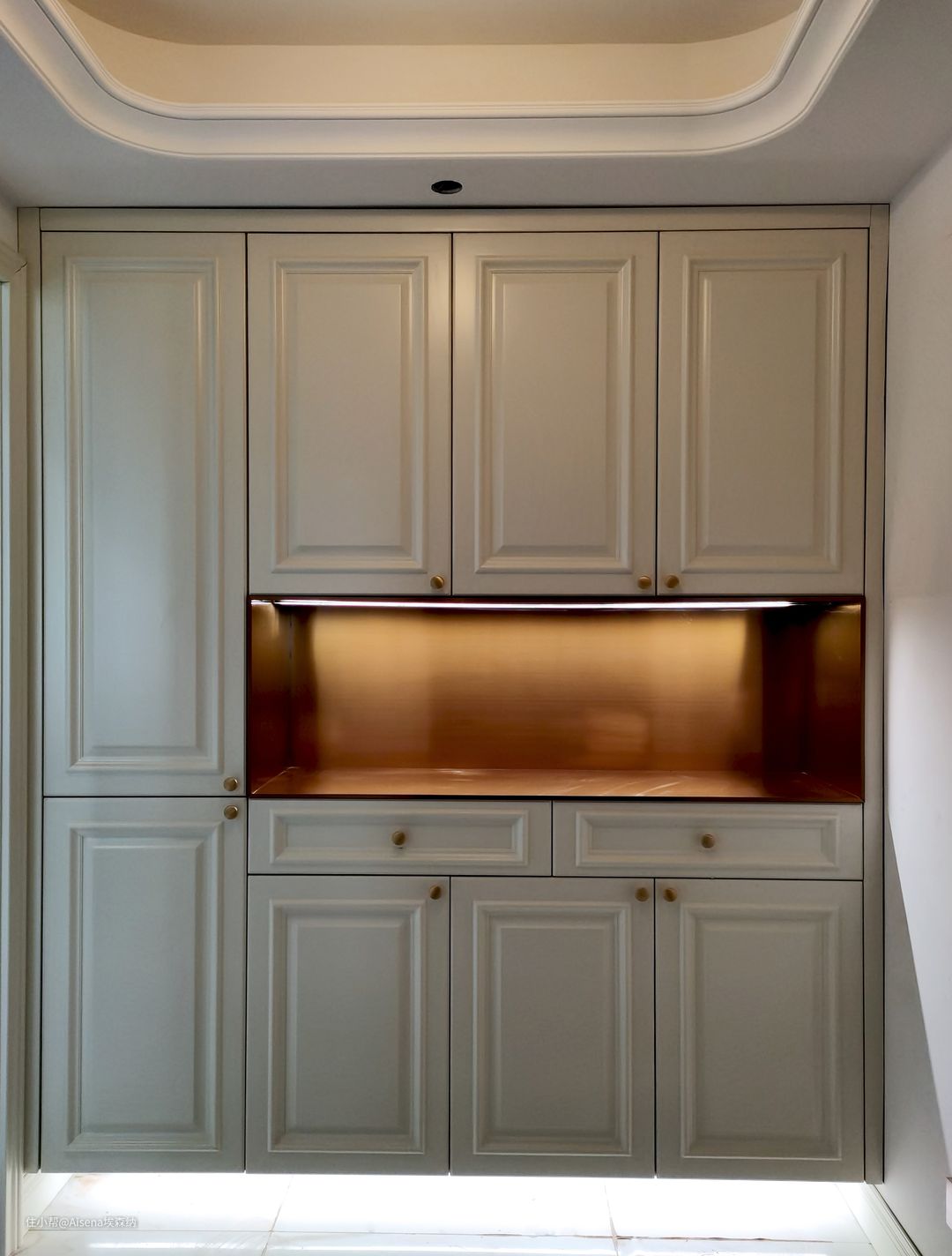 ▼站在玄关,映入眼帘的便是一个显露低调奢华的门厅柜,整体选用米白色烤漆板,门厅柜上高柜和抽屉的组合使得出入家门更衣储物更加方便;另外根据客户的个性化需求,其间有一个格外瞩目的玫瑰金色金属开放格,并加装了灯条,使得本来有些简单的柜体多了一分珠光宝气;柜体下方有个悬空加灯条的设计方便穿脱鞋履。