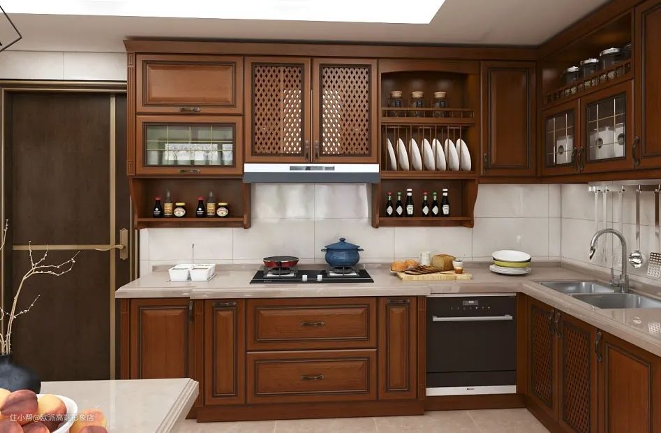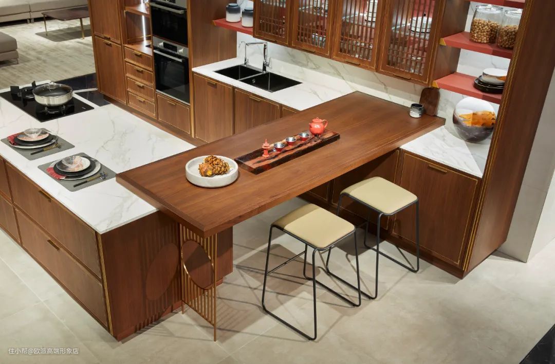 古典文化与传统风格,加入了现代化的设计元素。以回字形和网格形状作为橱柜门板,增添了不少中式视觉上的美感。温润古朴的色泽,兼具优雅简洁的造型 ,整个厨房散发着东方魅力。